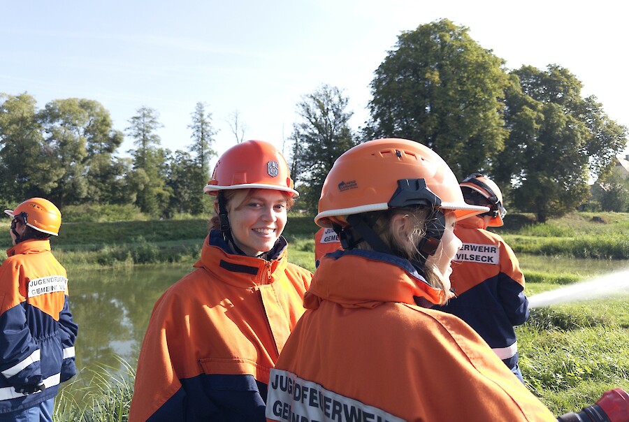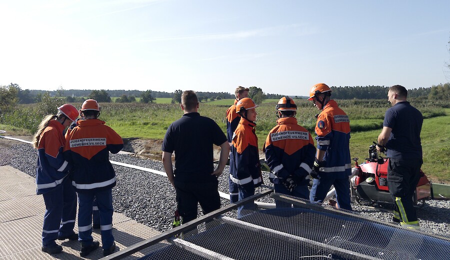 Bei sommerlichen Temperaturen übernahmen die Jugendlichen ihre Fahrzeuge und konnten deren Maschinisten um Rat fragen, wenn Gerätschaften oder Ausbildung unbekannt waren. Nach einem gemeinsamen Gruppenfoto wurden fast zeitgleich alle Gruppen zu unterschiedlichen "Einsätzen" alarmiert. Nach der Abarbeitung der ersten Einsätze und der anschließenden Aufbereitung der Gerätschaften, gab es nur eine kurze Verschnaufpause, ehe es wieder zu verschiedenen Einsätzen kam. Während es für die Gruppen 1 und 2 je zu einem "Keller unter Wasser" ging, musste durch die Gruppe 3 eine vermisste Person gefunden werden.