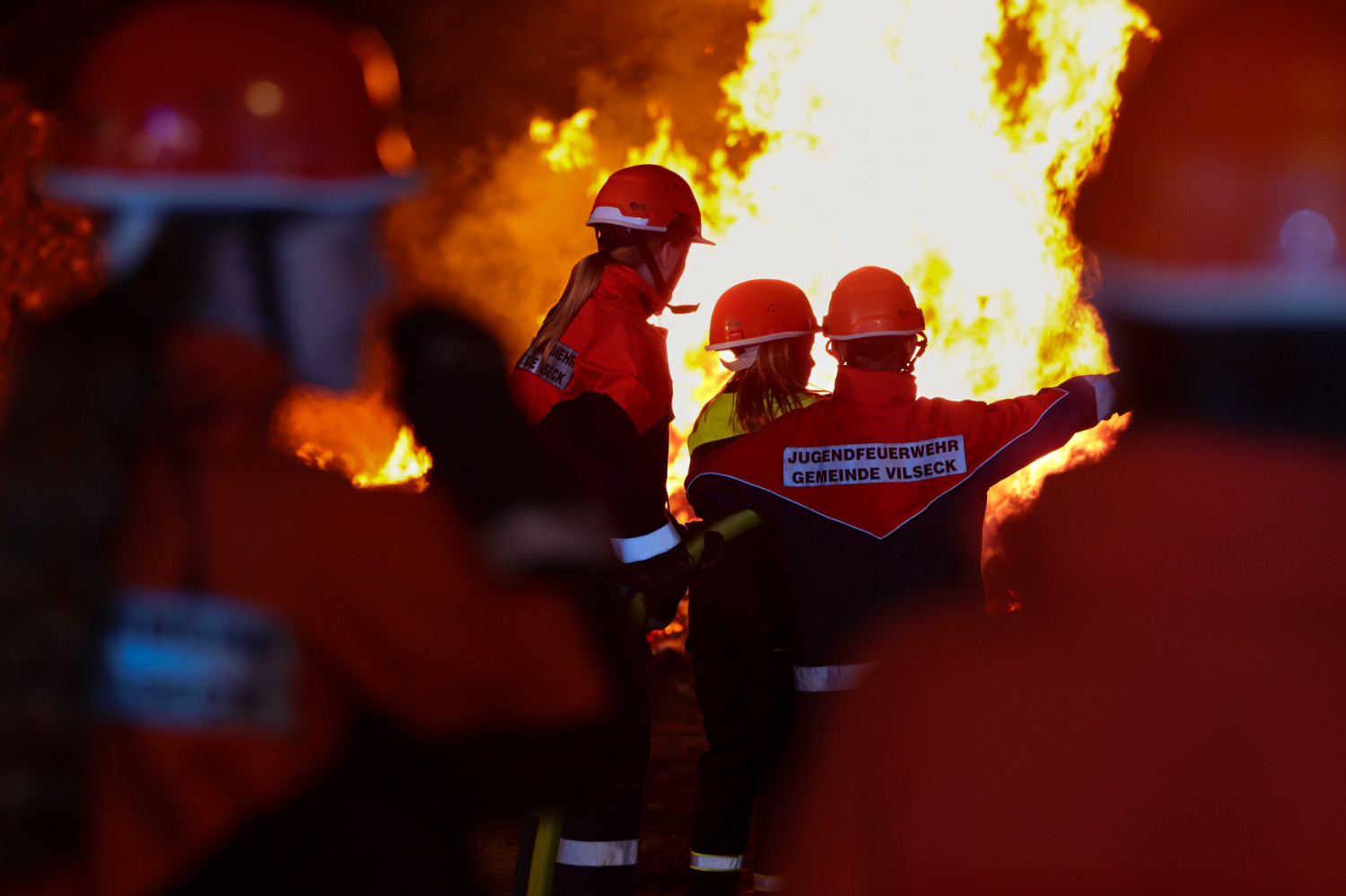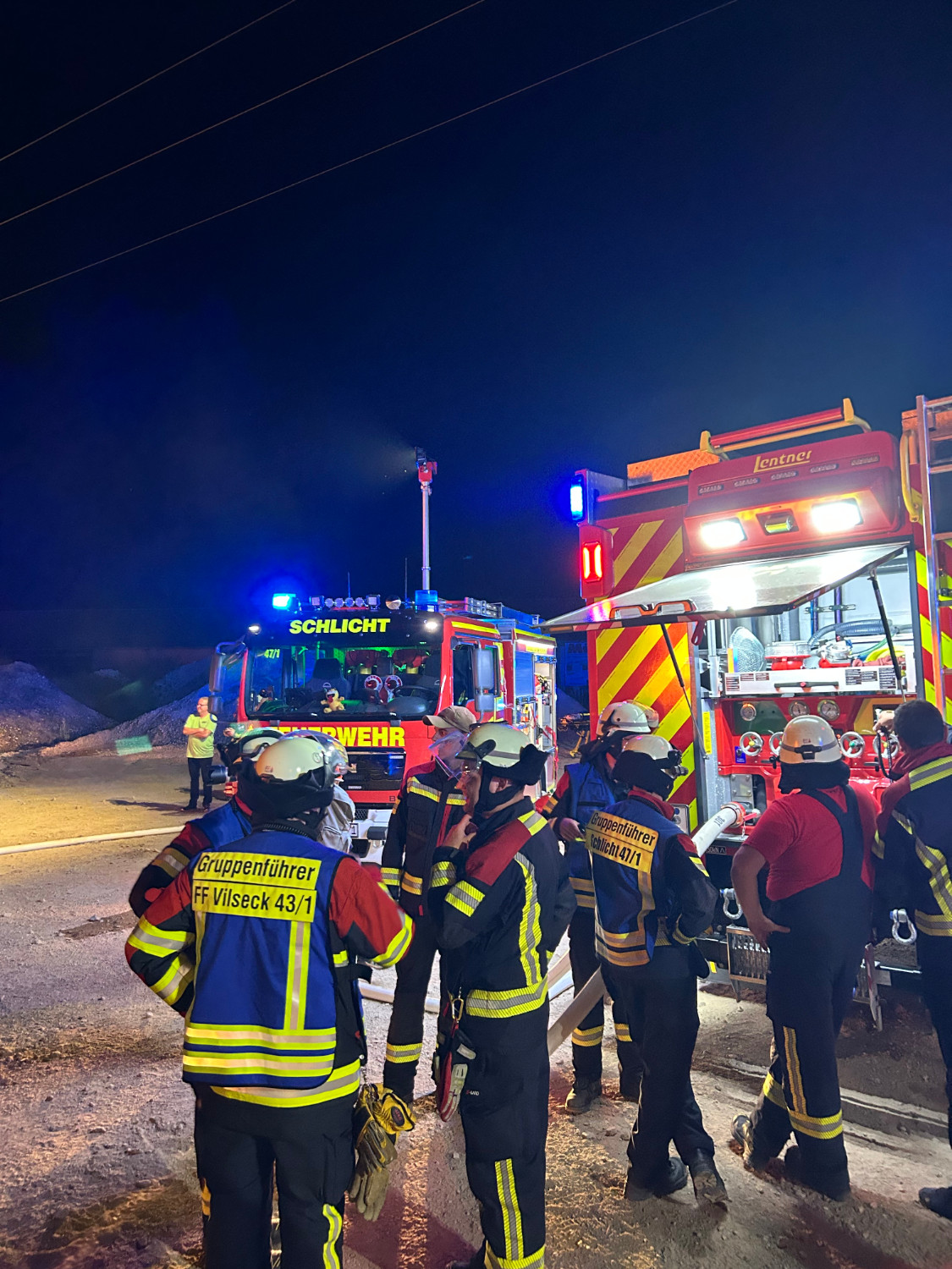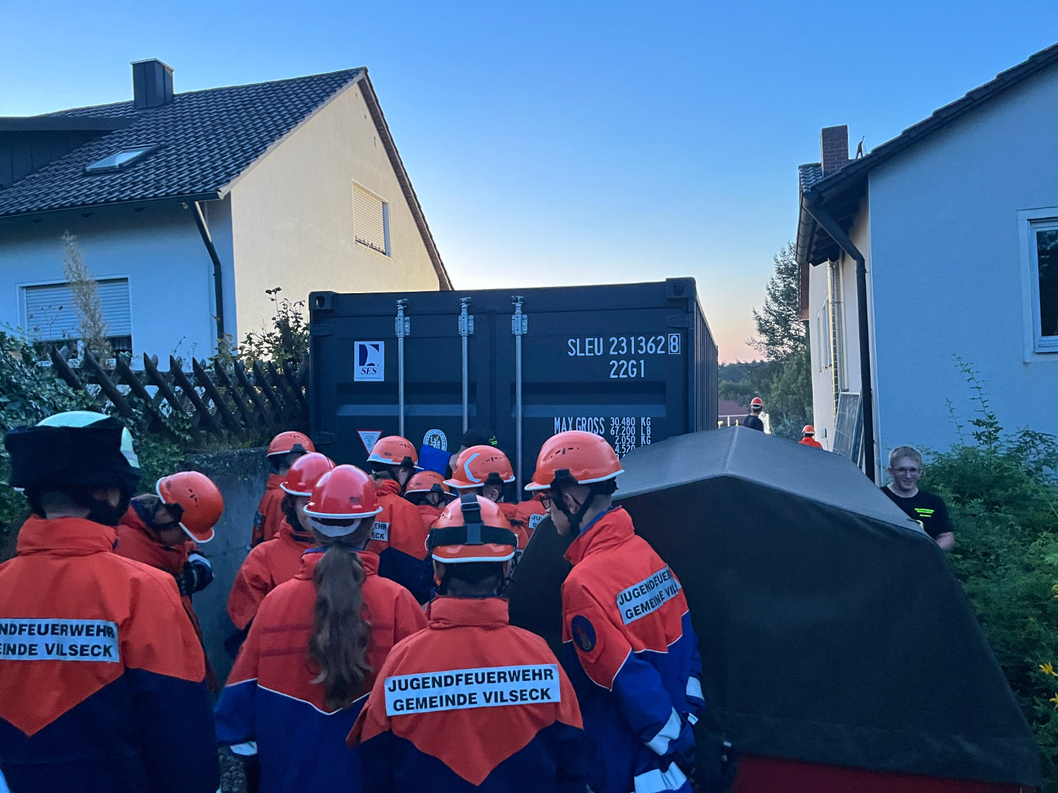 Verschiedene kleinere Einsätze (z. B. Tierrettung) beschäftigten die Jugendlichen bis zum Abendessen, das bei angenehmen Temperaturen im Hof der 24h-Wache verzehrt wurde. Gegen 22.00 Uhr konnte über der Stadt Vilseck bereits ein heller Feuerschein gesichtet werden, welcher im Anschluss zum "Vollalarm" aller Gruppen führte. "Großbrand auf einem Firmengelände", lautete die Alarmmeldung. Löschaufbau von verschiedenen wasserführenden Fahrzeugen, der Aufbau einer lagen Schlauchstrecke, die Verhinderung der Ausbreitung sowie die direkte Brandbekämpfung waren unter anderem die Aufgaben bei dieser Einsatzstelle.