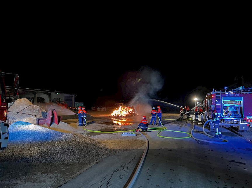 In kameradschaftlicher Gesellschaft konnten Ausbilder und die Jugendlichen der Gemeindejugendfeuerwehr Vilseck und die Gäste aus Freihung nach dem gemeinsamen Abendessen den Abend ausklingen lassen, spielten Spiele oder führten Unterhaltungen. Unterbrochen wurde der schöne Abend durch die Alarmdurchsage "Brand im Freien, drohender Übergriff auf Lagerhalle". Rasch waren die Fahrzeuge besetzt und der erweiterte Löschzug rückte zur Einsatzstelle aus. Vor Ort brannte ein großer Haufen Unrat, von dessen Wärmestrahlung ein Übergreifen auf eine angrenzende Lagerhalle drohte.