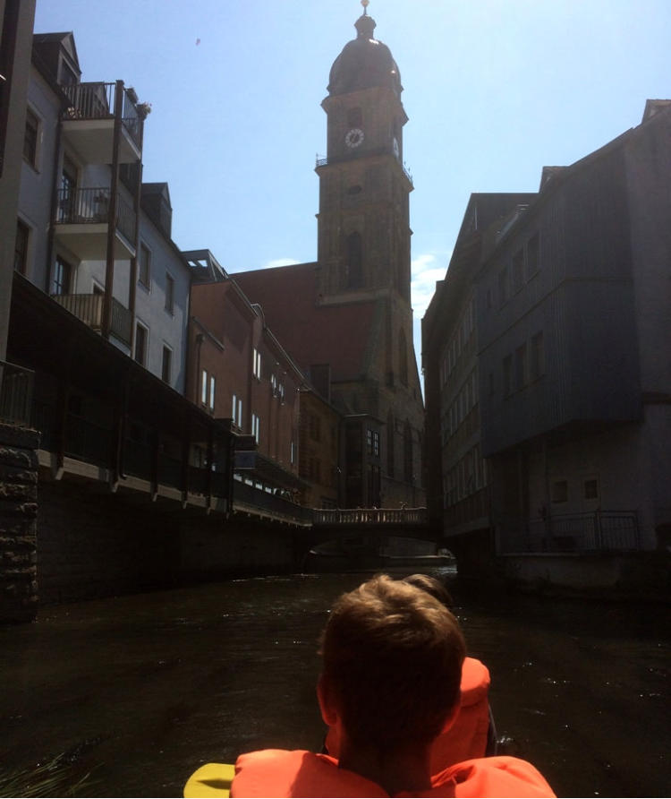 Nun näherten wir uns langsam den Toren der Stadt Amberg. Die historische Altstadt von der Wasserseite aus zu sehen war ganz besonderes eindrucksvoll. Vorbei an der imposanten Basilika St. Martin, unter der Amberger Stadtbrille hindurch, durchquerten wir das Landesgartenschaugelände bis zum Drahthammerwehr. Dort nahmen wir unsere Kanus aus dem Wasser und übergaben sie wieder an „Die Projektwerkstatt“.