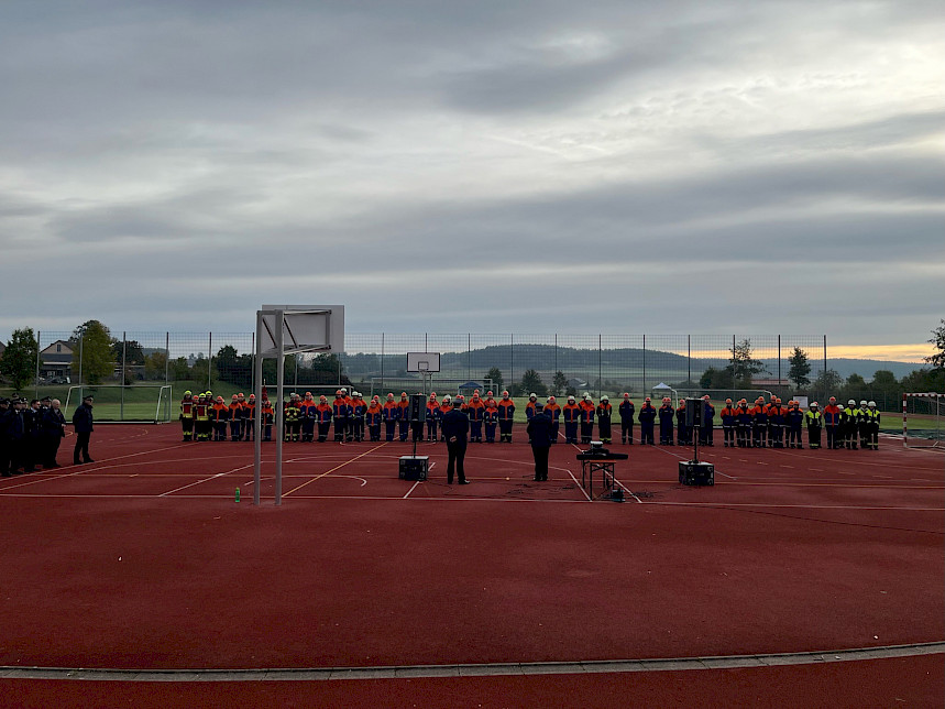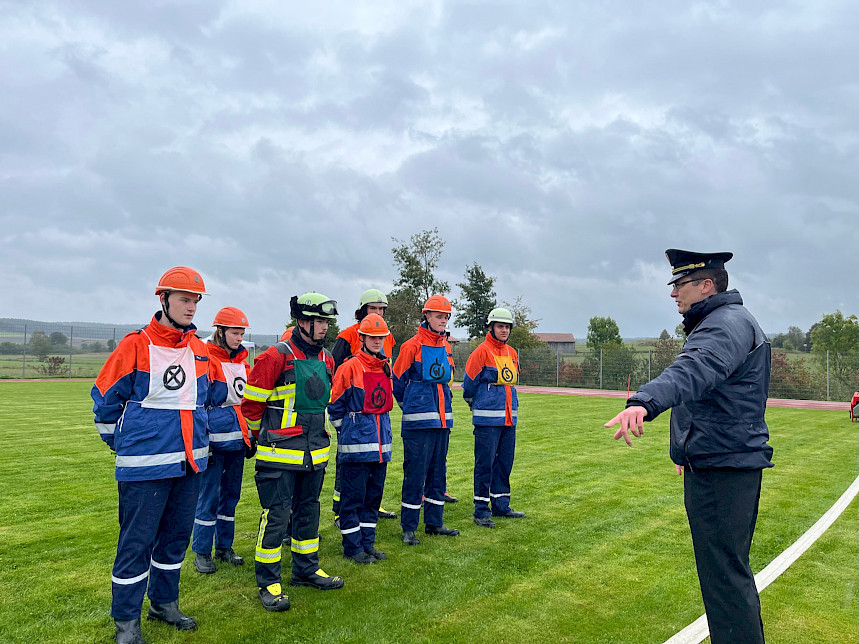 Nach kurzer Begrüßung durch den Kreisjugendwart Schmidt und dem Abnahmeberechtigten Brunner standen für die Feuerwehranwärter die Durchführung der Disziplinen vor den Augen der Wertungsrichter an. Brunner ging auf das "wohl höchste Abzeichen" in der Karriere eines Feuerwehranwärters ein und wünschte den Teilnehmenden viel Erfolg.