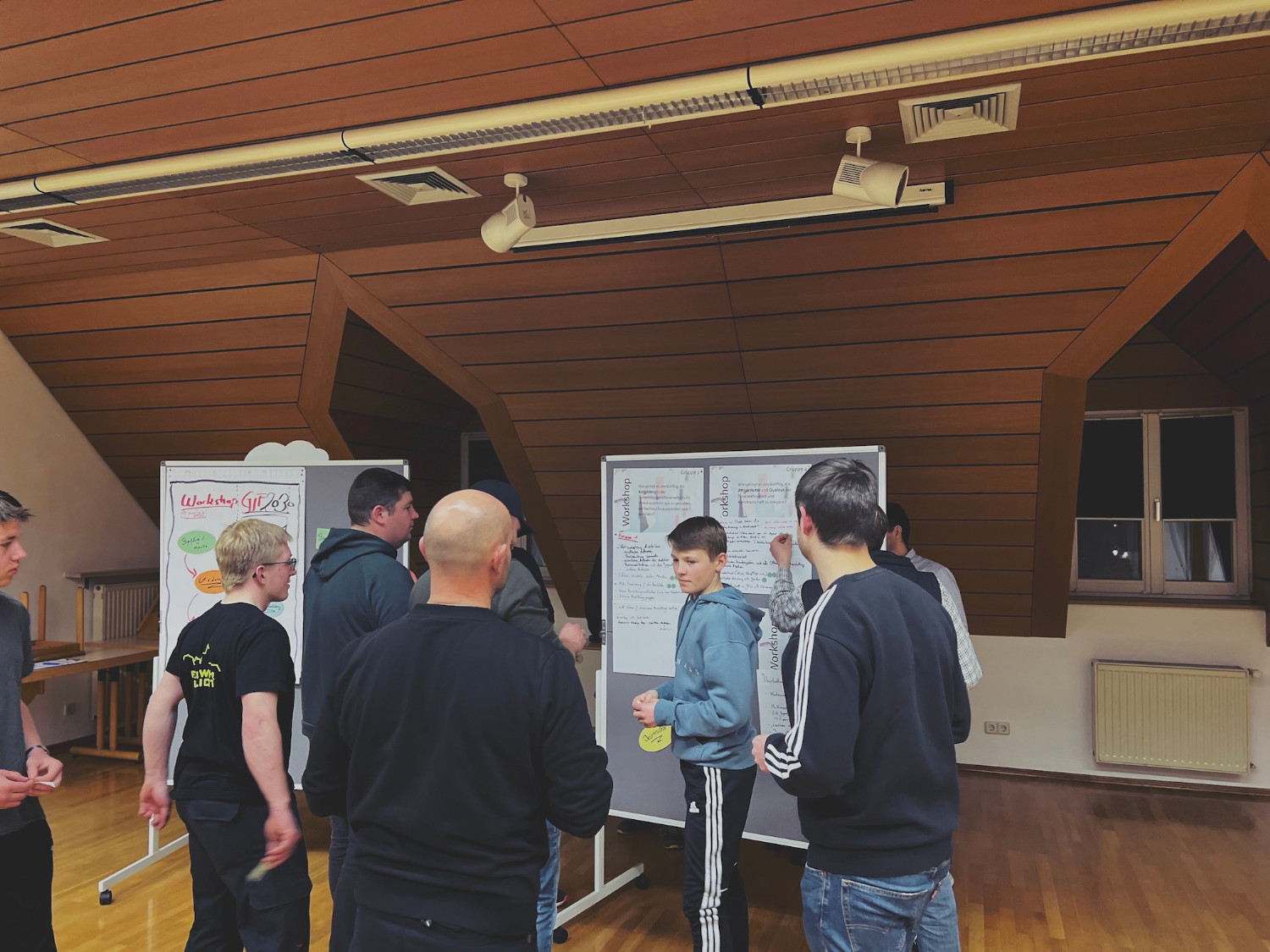 In einem kurzen Rückblick über eine durchgeführte Jugendumfrage im Jahr 2022 und der erarbeiteten Ergebnisse des ersten Workshop-Termins stimmte der Moderator des Abends auf die anstehenden Gruppenarbeiten ein. Aus den Ergebnissen des ersten Termins enstanden vier zentrale Fragen, die nun in vier Gruppen beantwortet werden sollten.