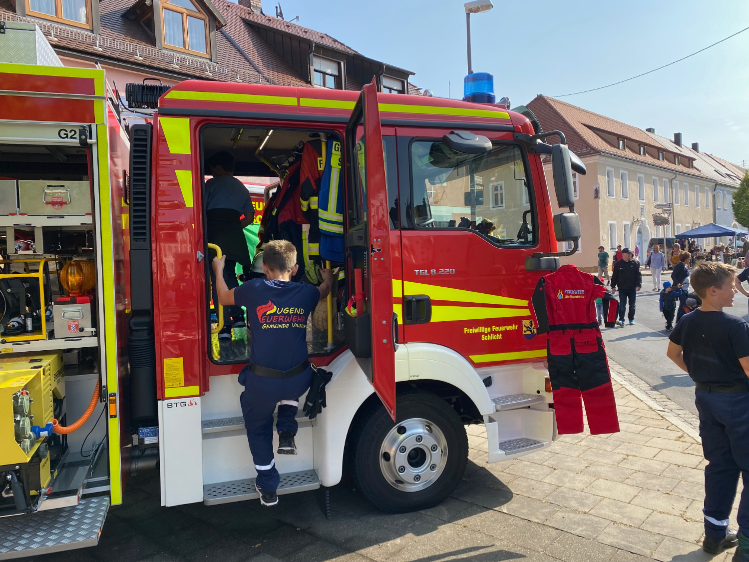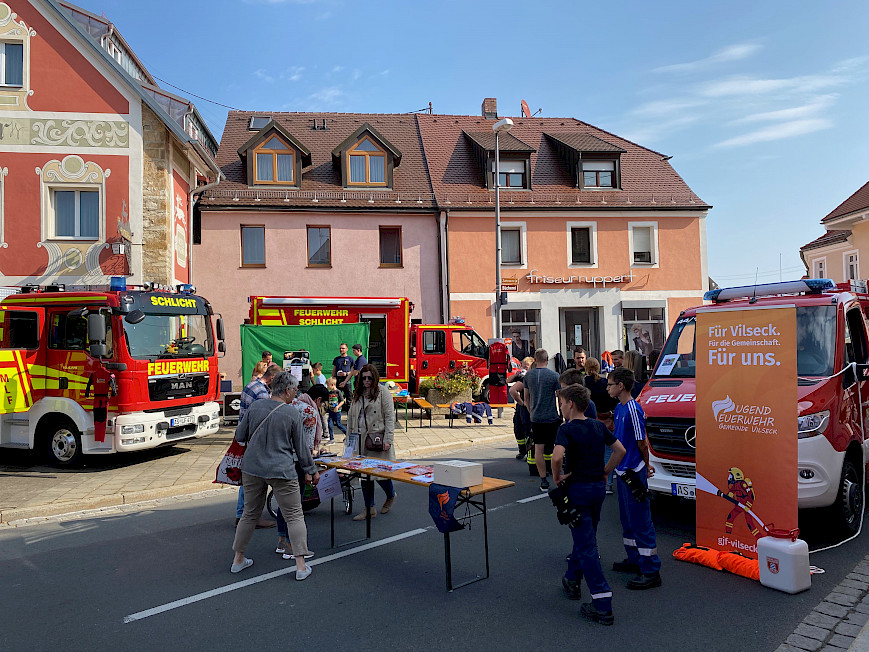 Für ein Highlight sorgte jedoch der Infostand der Jugendfeuerwehr Gemeinde Vilseck: aufgestellt mit vier Feuerwehrfahrzeugen aus der Großgemeinde, einer Greenscreen-Fotowand und einer Attraktion mit Wasser war auch hier für Jung und Alt etwas dabei. Während es die begeisterten Jugendlichen an, in und auf die Feuerwehrautos zog konnten sie unter Anleitung von Jugendfeuerwehrmitgliedern die Fahrzeuge erkunden und mit einer "Stempelkarte" Gegenstände finden um dann einen Turnbeutel zu gewinnen.