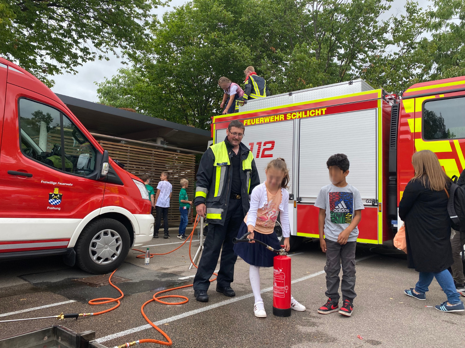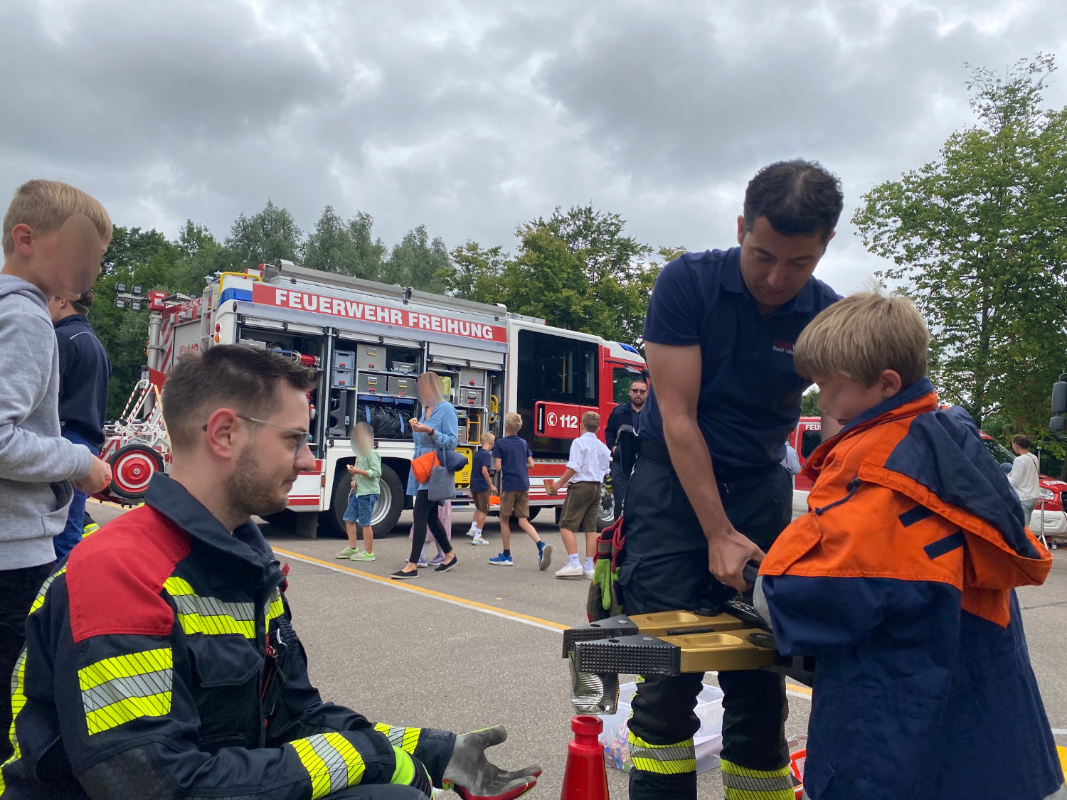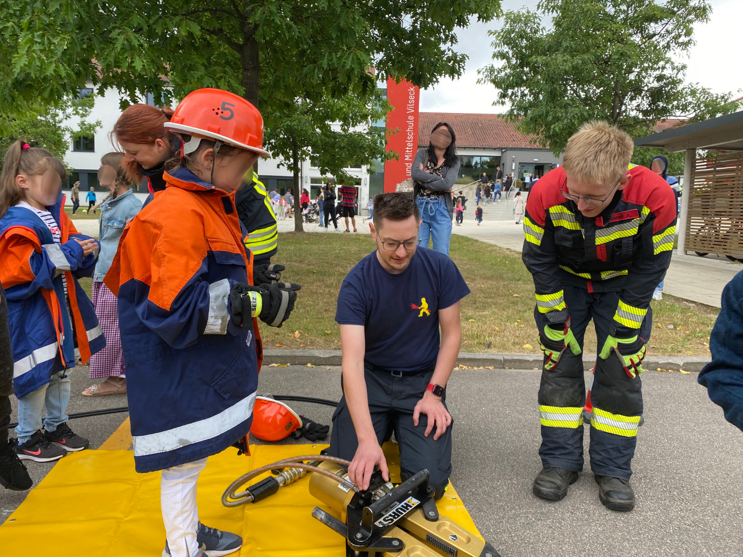 Nach der Aufführung von verschiedenen Schulklassen konnten sich die Schülerinnen und Schüler, deren Geschwister und Eltern, auf dem Schulgelände verschiedene Attraktionen anschauen. Zusammen mit der Jugendfeuerwehr Freihung präsentierte sich die Gemeindejugendfeuerwehr Vilseck auf dem Verkehrsübungsplatz: Feuerwehrfahrzeuge, Fahrzeugkunde, Geschicklichkeitsspiel mit Schere & Spreizer und einen Feuerlöschtrainer gab es zu entdecken.