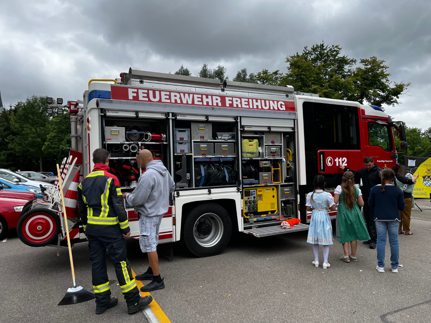 Um 10.00 Uhr konnte die Schulleiterin das Schulfest offiziell eröffnen und dankte neben den Schülerinnen und Schülern, den Lehrenden und vor allem auch dem Elternbeirat für die tatkräftige Unterstützung bei der Vorbereitung. 1. Bürgermeister Hans-Martin Schertl schloss sich den Grußworten an und wünschte allen Anwesenden ein schönes Fest und freute sich, dass sich auch die Feuerwehr bei diesem Festakt präsentierte.