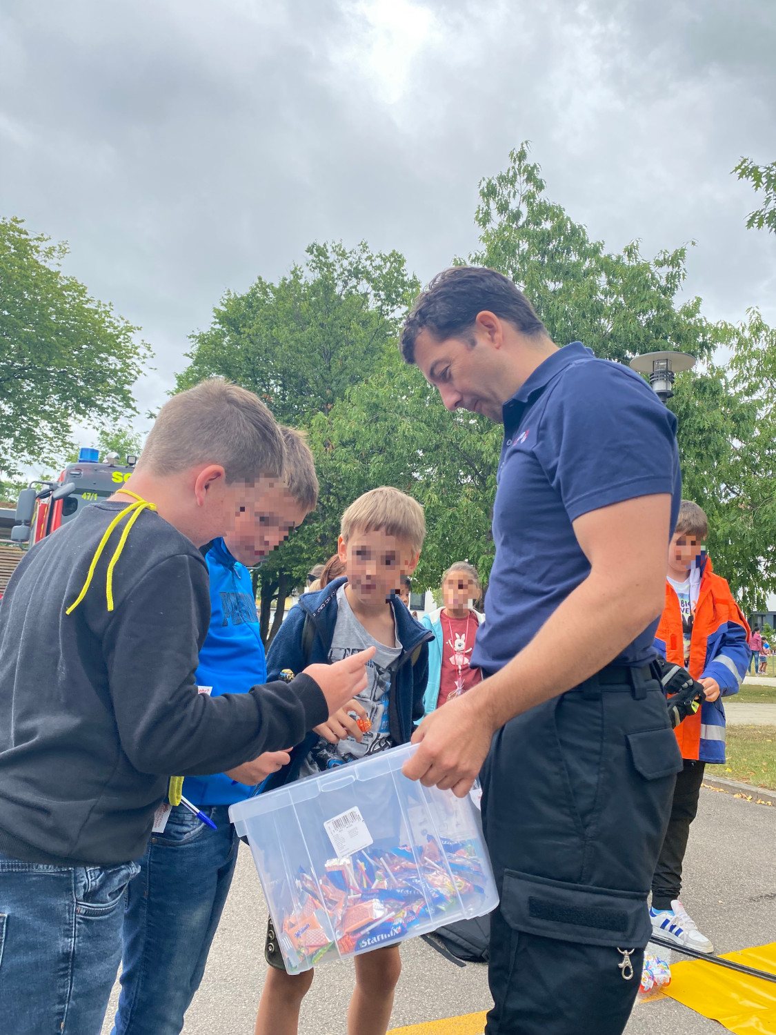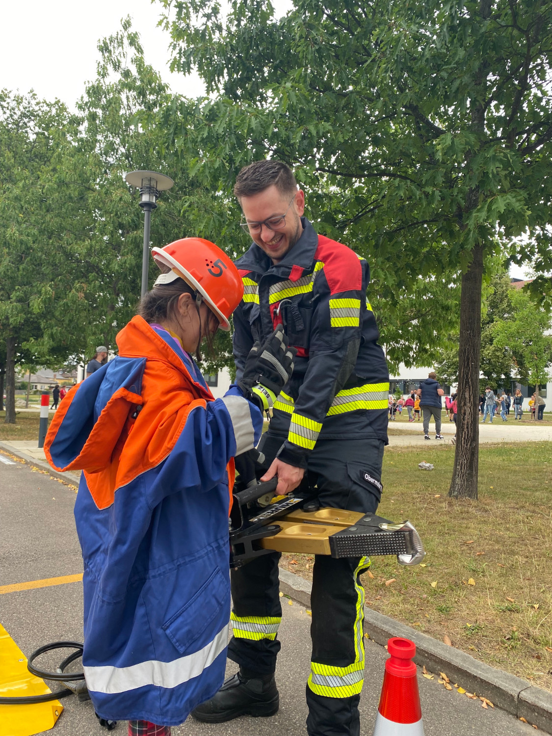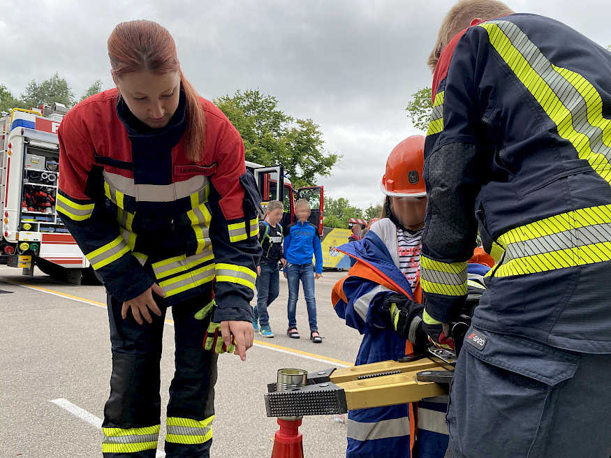 Eine lange Leitung, die vom MLF zu einer Plane führte zog die Aufmerksamkeit auf sich. Was sich dahinter verbarg? Neugierige Kinder und auch der eine oder andere Erwachsene hatten die Möglichkeit, sowohl Rettungsschere als auch Rettungsspreizer in die Hand zu nehmen. Ziel war es damit unter Führung von Feuerwehrkräften eine Dose zu greifen und diese von einer Pylone zur anderen zu transportieren. Die Herausforderung dabei: die Dose sollte nicht zerdrückt werden. Mutige Teilnehmer konnten sich eine Stufe schwieriger herantrauen und das gleiche sogar mit einem Überraschungsei versuchen und dieses dann im Anschluss selbstverständlich behalten.