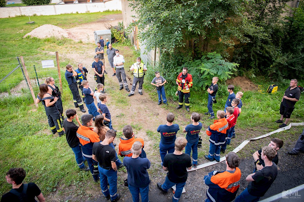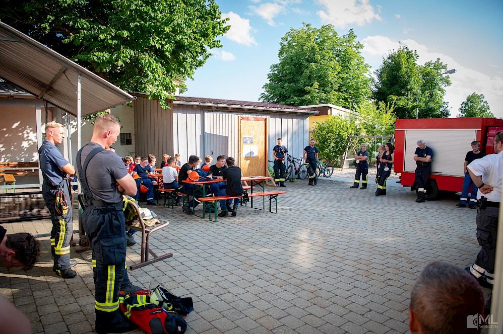 Bei herrlichem Sommerwetter konnten Gemeindejugendwart Niklas Obermeier und sein Stellvertreter Tobias Tuchbreiter knapp 50 Personen im Übungshof der Feuerwehr Vilseck begrüßen: Neben den Jugendlichen nahmen auch einige Aktive der Feuerwehren aus der Großgemeinde und ein Team des Bayerischen Roten Kreuzes (BRK) teil, um eine realistische Einsatzsimulation ermöglichen zu können. Leider musste der Hauptplaner der Übung, Jugendausbilder Thomas Lippik, kurzfristig in das vom Hochwasser schwer getroffene Katastrophengebiet Arthal reisen und sich daher entschuldigen lassen.