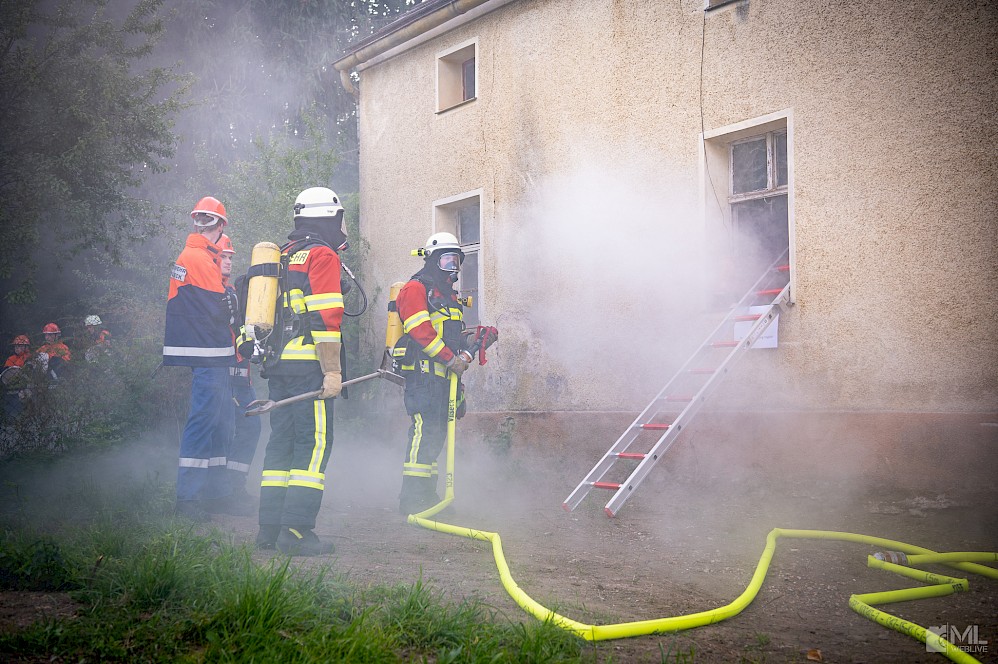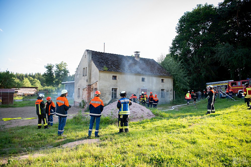 Am Übungsobjekt selbst konnte ein aufgeregter Hausbesitzer die ersteintreffende Besatzung des Tragkraftspritzenfahrzeugs (TSF) Ebersbach 44/1 in Empfang nehmen und panisch von einem lauten Knall, seinen vermissten Kindern und der mittlerweile stark sichtbaren Rauchentwicklung berichten. Nachdem der "Hausbesitzer" beruhigt und notwendige Informationen eingeholt wurden, konnten die Jugendlichen des ersten Fahrzeugs bereits den Verteiler und eine erste Schlauchleitung von einem nahegelegen Hydranten legen. Kurz nachdem diese Maßnahmen abgeschlossen waren rückte das Tanklöschfahrzeug (TLF) Vilseck 21/1 an und wurde durch den ersten Gruppenführer in die vorgefundene Lage eingewiesen: Schnell wurde klar, dass auch der Einsatz von Atemschutzgeräteträgern auf Grund der starken Verrauchung notwendig wird. In rascher Folge kamen auch die weiteren Einheiten (das Mittlere-Lösch-Fahrzeug (MLF) Sorghof 47/1, das TSF Schönlind 44/1, der Gerätewagen-Logistik (GW-L) Vilseck 55/1 und das Mehrzweckfahrzeug (MZF) Schlicht 11/1) an, woraufhin der Einsatz verschiedener Kräfte an verschiedenen Orten möglich wurde.